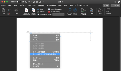 • そうすると変なところに数式番号が出るので,右クリックで「フィールドの表示/非表示」をクリック